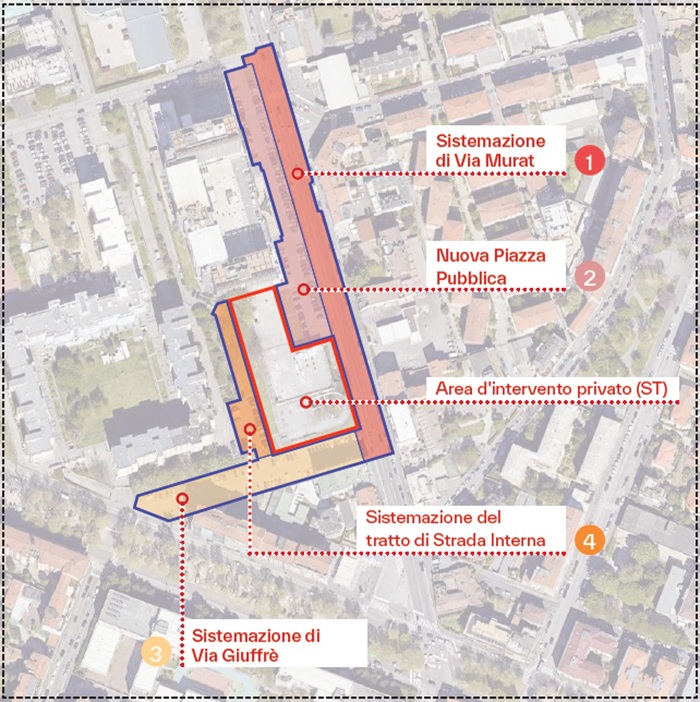 • via Murat: realizzazione di una nuova piazza pubblica pedonale a sostituzione del parcheggio a raso attuale, con spazi a verde e piantumazioni, aree pedonali pavimentate e aree dedicate alla sosta;