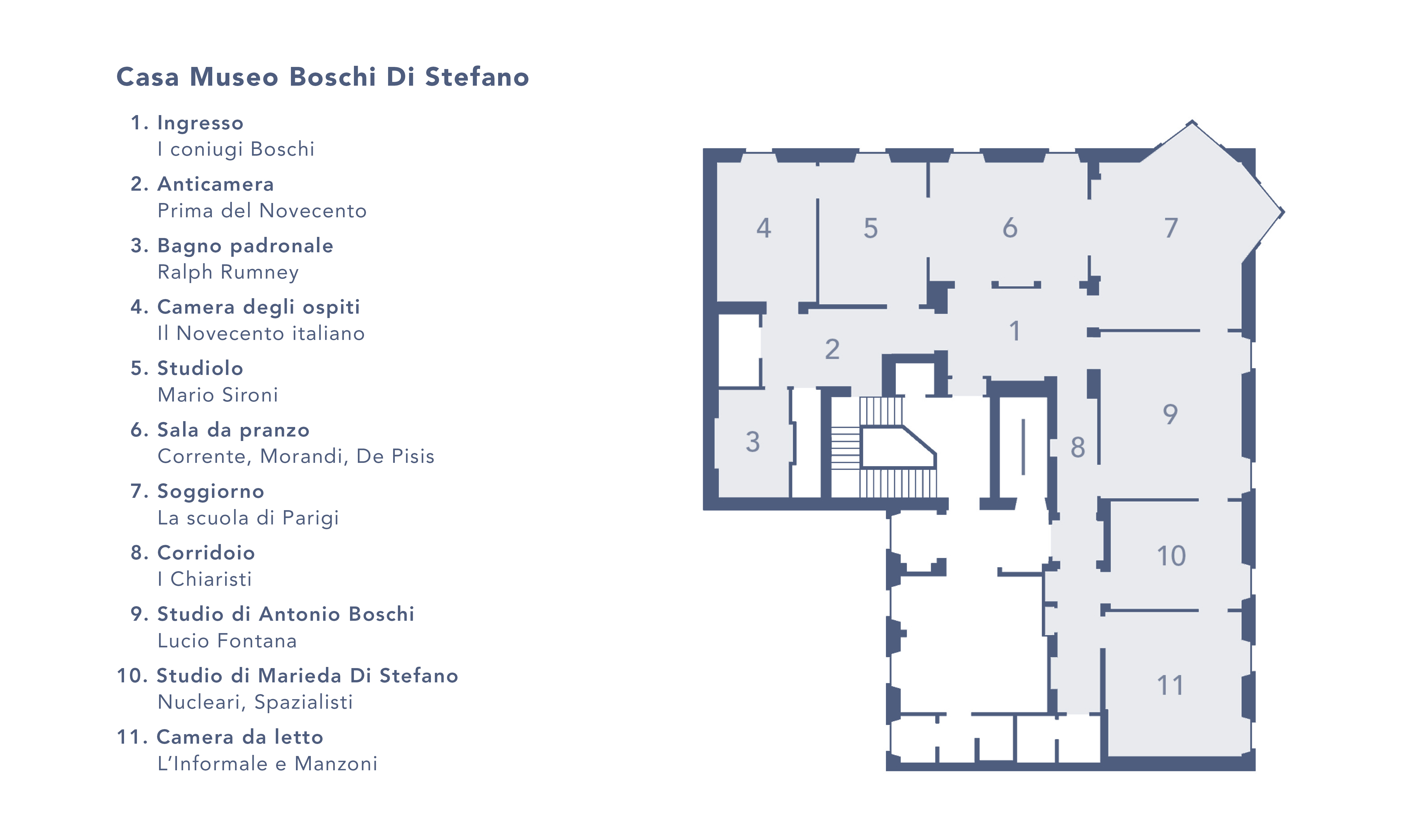 La brochure, le schede di sala e la mappa della Casa Museo sono scaricabili nella sezione Allegati in fondo a questa pagina.