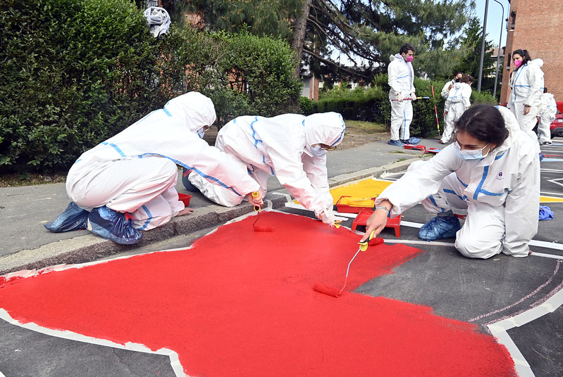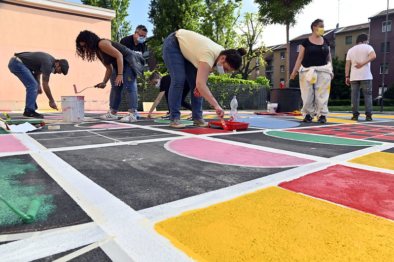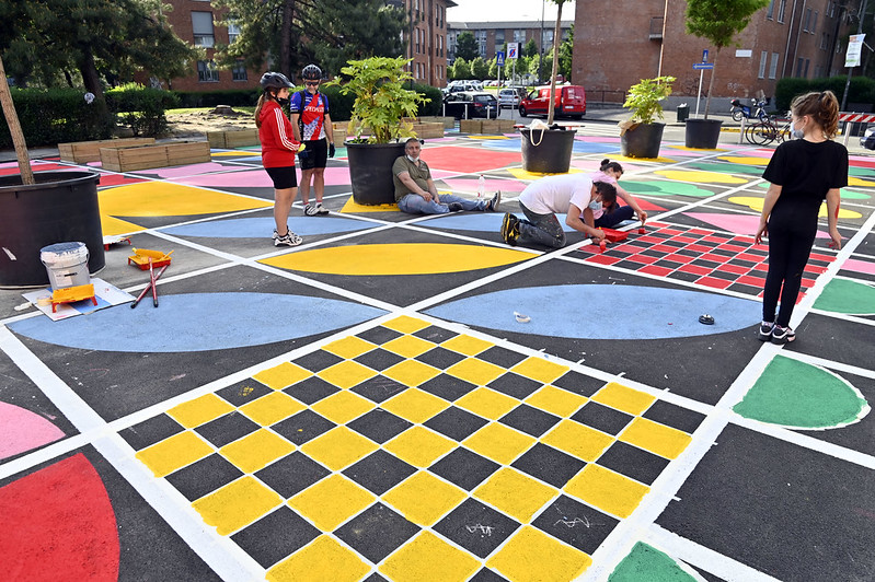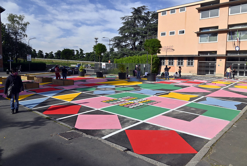 L’intervento di urbanistica tattica ha realizzato nell’area davanti alla scuola primaria dell’ICS Via Val Lagarina una nuova coloratissima piazza in quella che prima era una zona adibita a parcheggio. L’originale e ambizioso pattern è stato ideato dalla Designer Serena Confalonieri a seguito di un percorso partecipativo con la scuola e gli altri firmatari del patto.